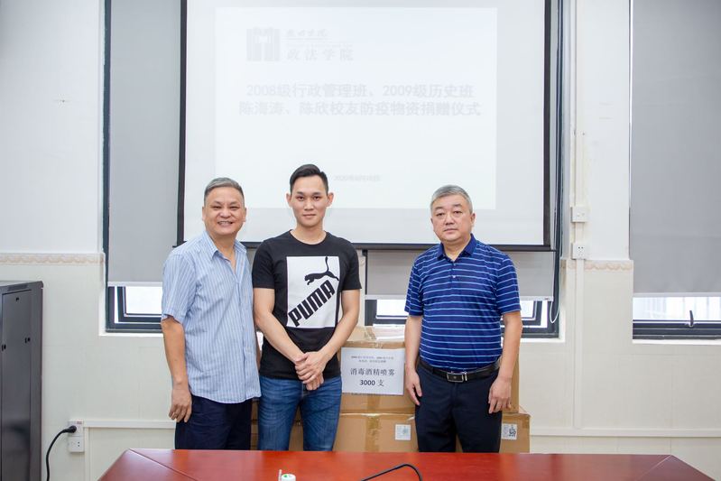 蒋炜院长和李实书记代表学院接受了陈海涛夫妇捐赠的防疫消毒酒精喷雾3000支,并向校友回赠了政法学院纪念品。