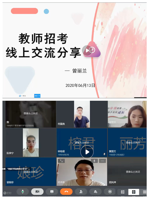 为提升2020届师范生教师招考综合能力,帮助有志于从事教育行业的同学提前做好相应准备、早日实现“教师梦”,6月13日下午,地理与旅游学院通过钉钉直播举办了“学业与就业——优秀校友教师招考经验分享会”,邀请五位已经走上教师工作岗位的优秀校友围绕教育实习、教师招聘、教学体验等主题作专题分享。