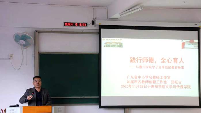 本网讯 11月28日下午,文学与传媒学院邀请广东省中小学名教师工作室主持人郑旺吉分享教育故事,主讲“践行师德,全心育人”主题讲座,本次讲座由教务处主办,文学与传媒学院承办。学院院长陈梦、党总支副书记施少翰、辅导员刘建辉老师及18级汉语言文学专业学生聆听了此次讲座。