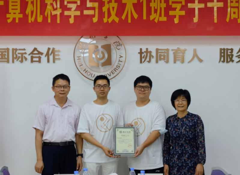 赖院长、陈书记代表学校为2007级计算机科学与技术1班的全体校友颁发了捐赠证书。班级代表、原班长王火亮、谢炀平代表接受了证书。